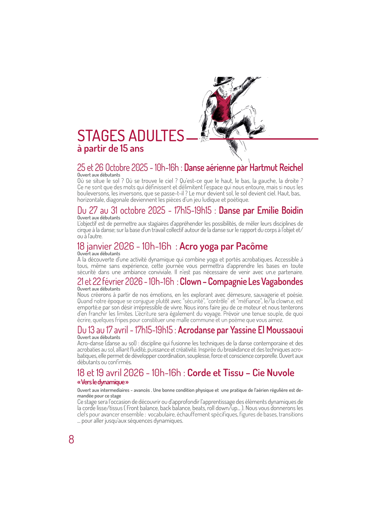 Acrobatie, aériens, jonglerie, équilibre sur objets, expression corporelle et clownesque : cinq disciplines pour s’exprimer, s’ouvrir aux autres et s’épanouir. Grâce à une pédagogie orientée vers la créativité, l’initiative, le plaisir et le collectif, c’est avant tout les valeurs de citoyenneté, de dépassement de soi et d’expression que nous travaillons.